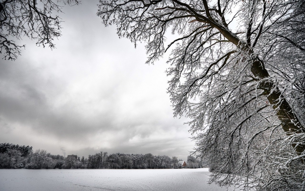 Скачать обои для рабочего стола Зимний лес и домик вдали и фото