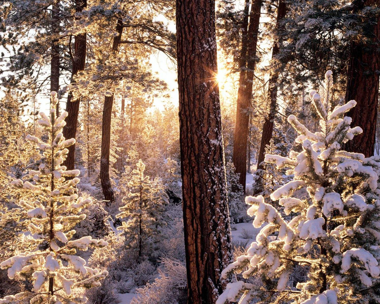Скачать обои для рабочего стола Зимний лесной вид на фоне солнечных лучей и фото