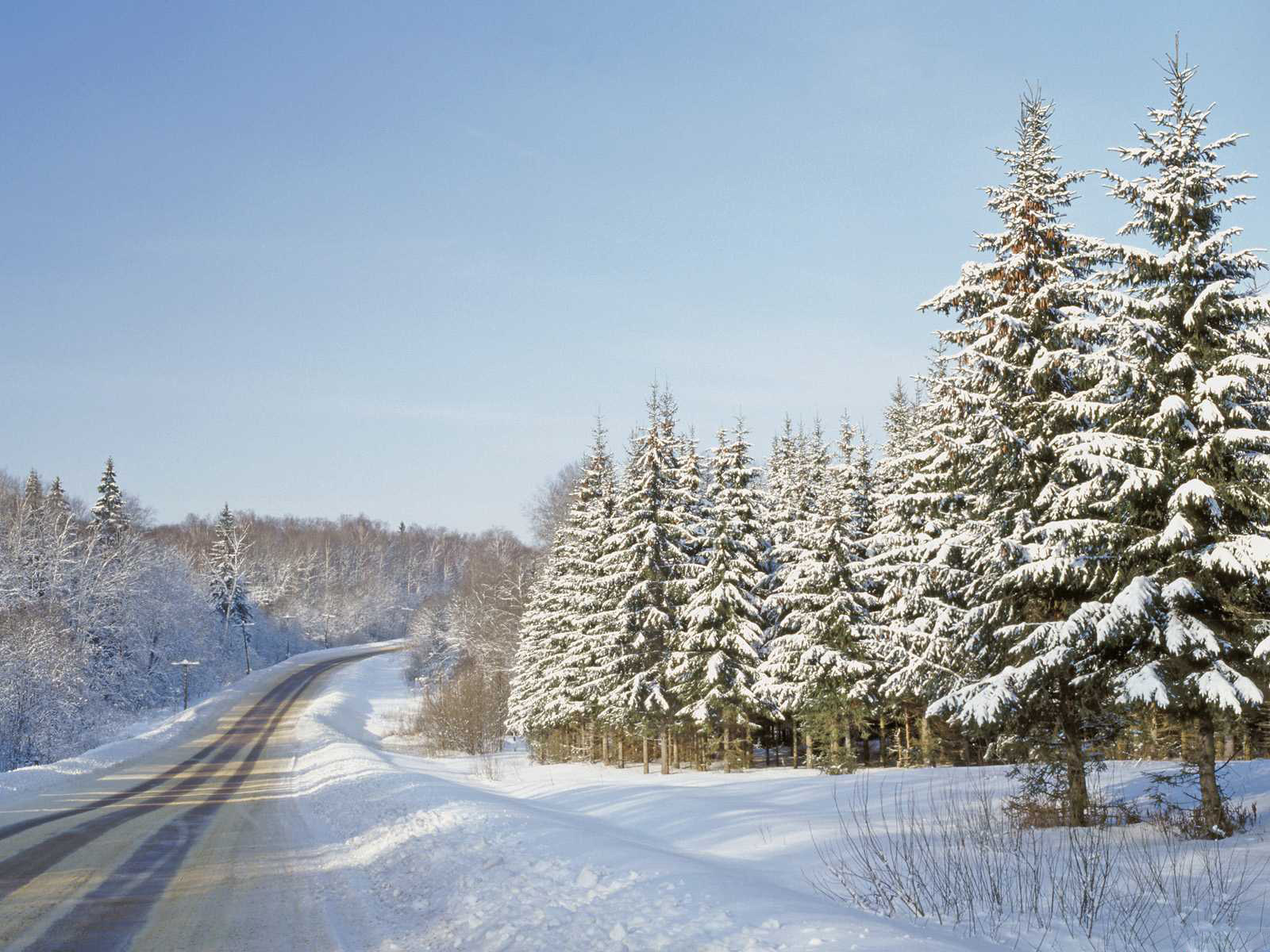 Скачать обои для рабочего стола Зимняя дорога вдоль елей и фото