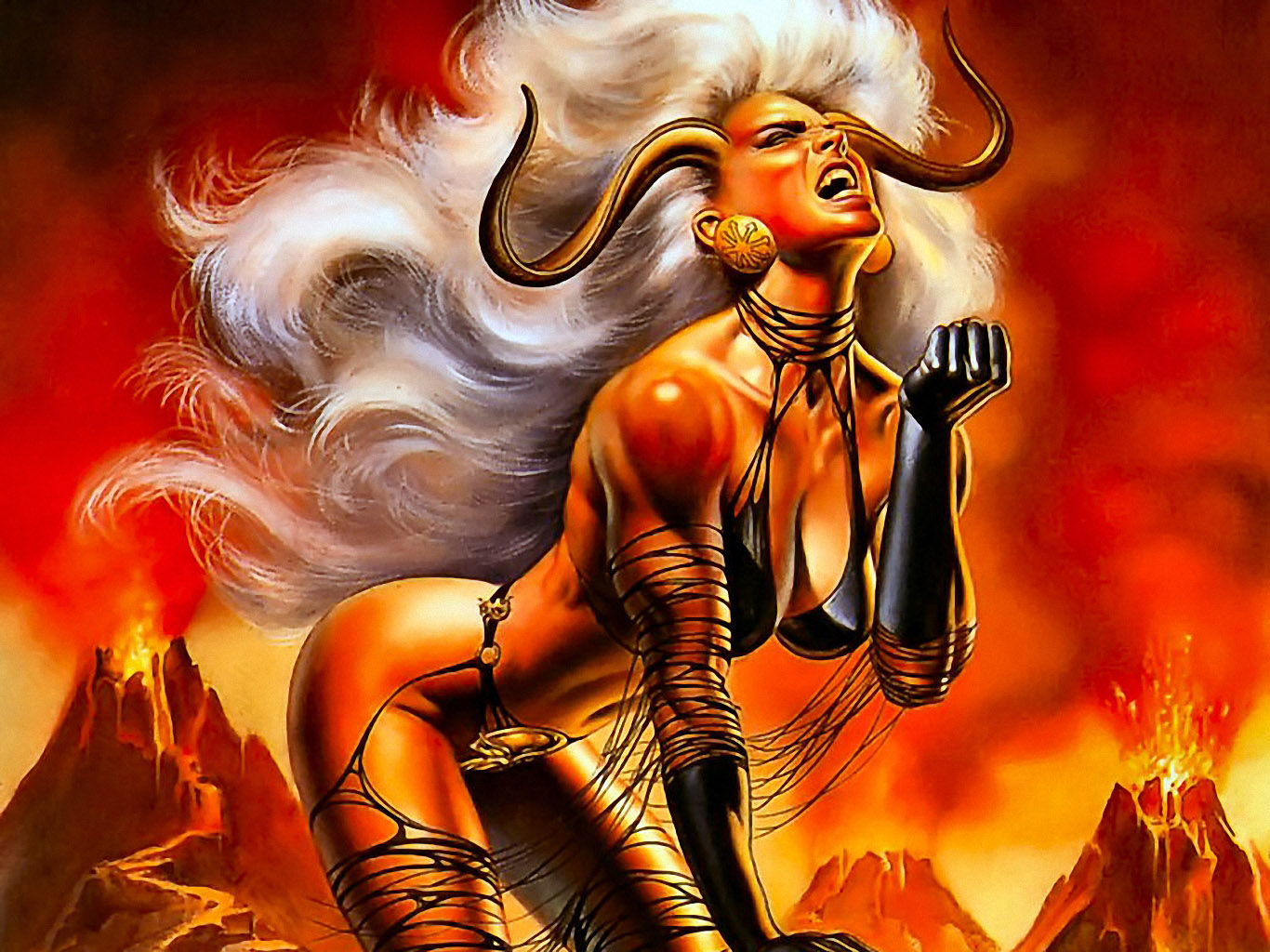 Похожие обои на Злобная дьяволица на фоне вулканов: