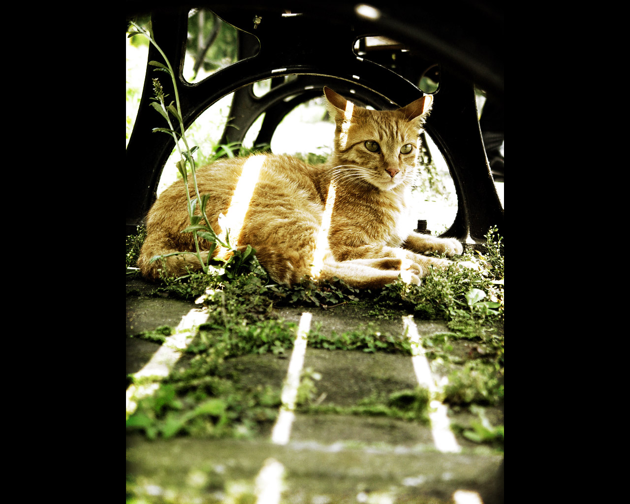 Скачать обои для рабочего стола Золотистая кошка под лавочкой и фото