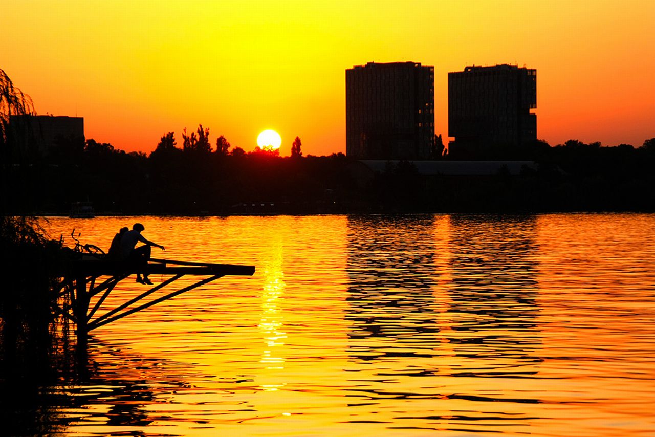 Скачать обои для рабочего стола Золотой закат на городском озере и фото