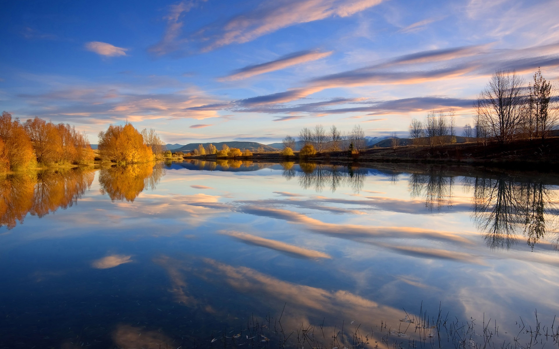 Скачать обои для рабочего стола Золотые кустарники на берегу реки и фото