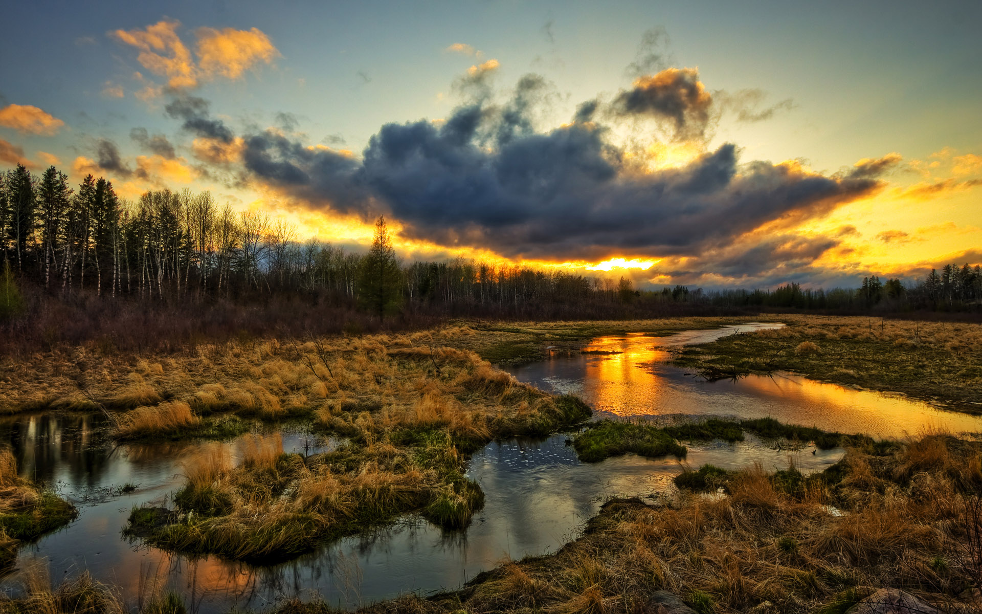 Скачать обои для рабочего стола Золотые облака над топями и лесом и фото